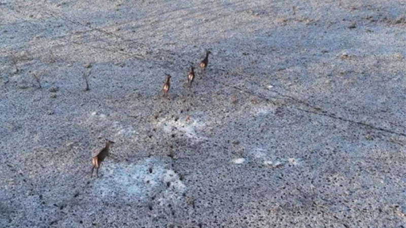 Karla kaplı dağlarda koşuşturan geyikler dronla böyle kaydedildi